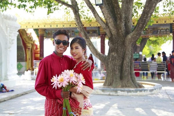 偶遇一對即將結(jié)婚的新人,緬甸的男人穿的裙子叫“隆基”,女孩穿的裙子叫“特敏”,如果男人穿著“隆基”接待客人代表了對客人***隆重的禮遇。